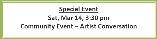 The public is invited to a Community Event and Conversation with the artists on Saturday, March 14, beginning at 3:30 pm. We look forward to coming together in peace, love and harmony.