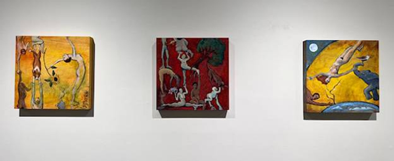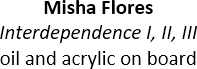 Through the visual language of stacking figures together, without strict adherence to gravity or scale, Misha Flores' Interdependence I, II, III (three separate though related oil and acrylic works on board) is a playful and joyful antidote to the constricting emotions of greed and selfishness, showing that all individual beings are necessary for all to rise.