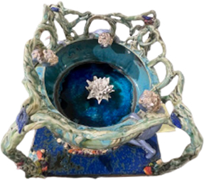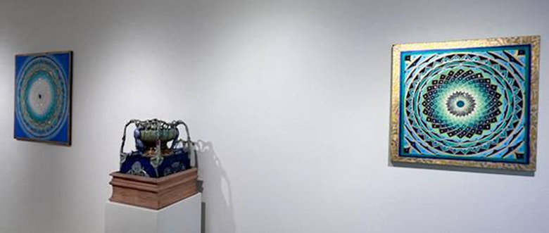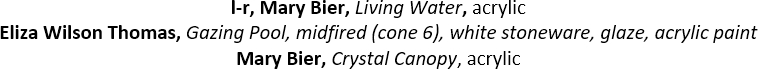 | Mary Bier is showing four of her intricate mandalas, providing an opportunity to pause and meditate on our individual place in the universe, while reflecting on the wisdom gained when we respect and care for each other. With Gazing Pool, (midfired-cone 6, white stoneware, glaze, acrylic paint) Eliza Wilson Thomas, invites viewers to find their own relationship to the work, while tapping into universal human experiences.