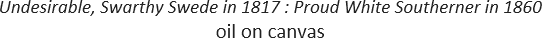 As the United States approaches the 250th anniversary of the Declaration of Independence—alongside national ICE protests—Musser offers a glimpse into the origins of our national crisis. One way that he reflects on and approaches these events, falls loosely into the category of historical painting. The second aspect investigates the many ways race has affected his family. The painting titled "Undesirable, Swarthy Swede in 1817: Proud White Southerner in 1860" asks what was lost when his father's side of the family morphed from being not the right kind of white in 1817, to fighting proudly for the Confederacy in a single generation.