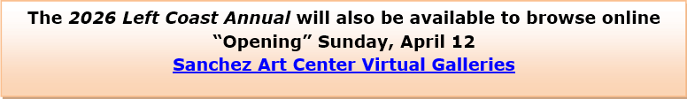 Juror Scott A. Shields, Ph.D., Ted and Melza Barr Chief Curator and Associate Director, Crocker Art Museum, Sacramento, selected 50 pieces from a remarkable group of more than 1,000 entries by artists from all five states that rim the Pacific Ocean (Alaska, California, Hawaii, Oregon, and Washington). Reflecting on the submissions, Shields noted, "We are, at this moment, experiencing a period of profound insecurity, one in which intersecting crises ranging from war, pandemics, environmental degradation, and intense political polarization have left many both literally and figuratively displaced and destabilized. Because art reflects its time, many of these realities are manifest in the pieces I reviewed for the 2026 Left Coast Annual at the Sanchez Art Center."