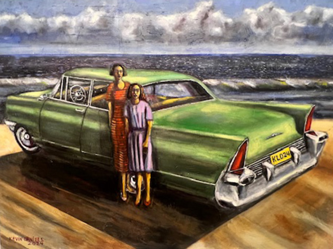 | Figurative artist Kevin Lance Daniels comments about his work, "Art, in the end, is a relentless impulse to understand life and connect with others. In Road Trip (oil on canvas), Daniels offers us the shared experience of connection both between two individuals across generations, as well as in their relationship to the environment as they encounter the beach and sea.