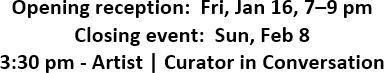 Sanchez Art Center is located at 1220 Linda Mar Blvd in Pacifica, about a mile east of Highway 1. Following opening night, the galleries are open Friday, Saturday, and Sunday, 1–5 pm, and by appointment, through Feb 8.