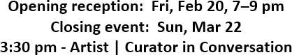 Sanchez Art Center is located at 1220 Linda Mar Blvd in Pacifica, about a mile east of Highway 1. Following opening night, the galleries are open Friday, Saturday, and Sunday, 1–5 pm, and by appointment, through Mar 22.